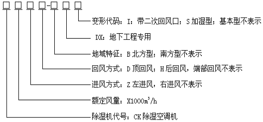 型號(hào)示例: CK12-DX 表示名義風(fēng)量為12000m3/h,回風(fēng)方式為端部回風(fēng)的南方型地下工程用除濕空調(diào)機(jī),面對(duì)機(jī)組控制器,回風(fēng)口在右側(cè)。